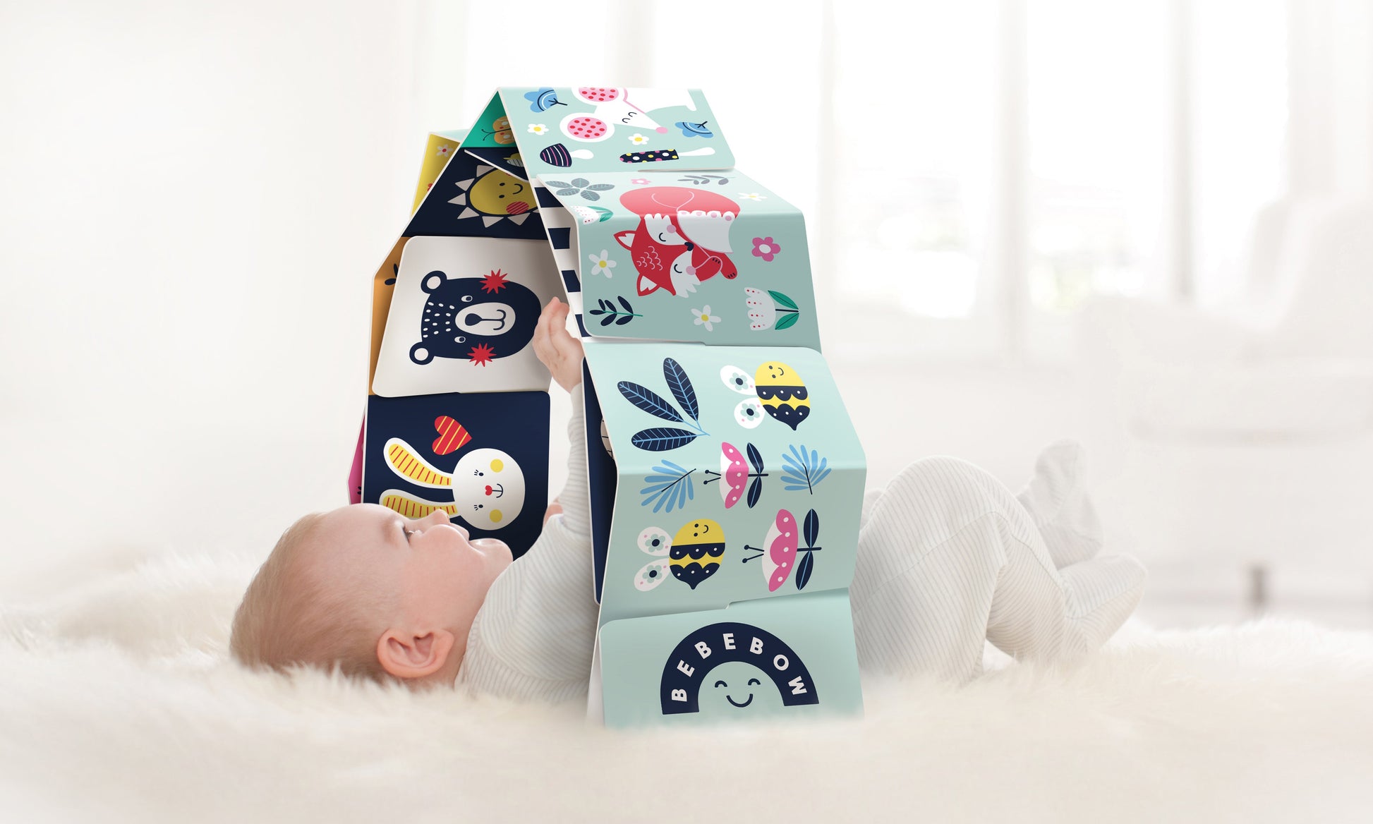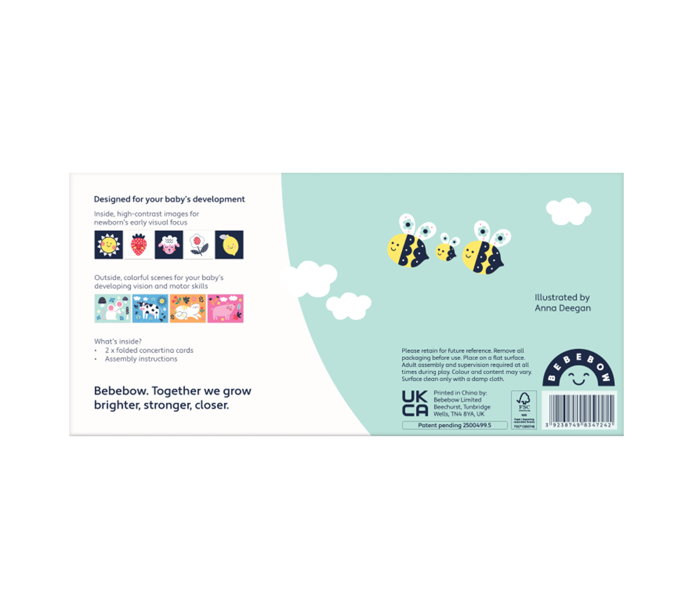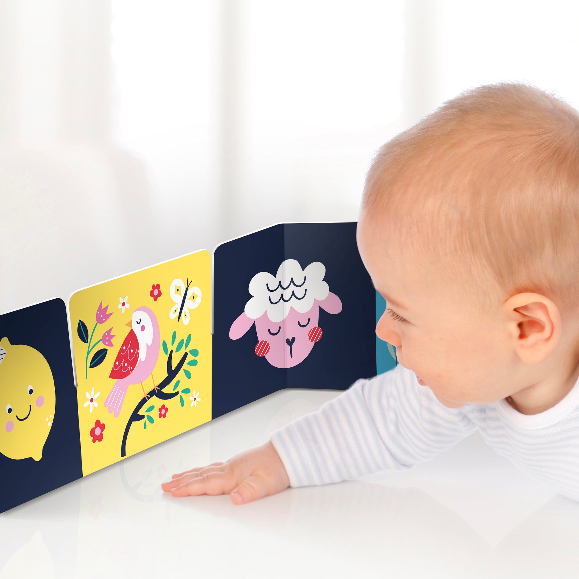 Printed with over 40 pictures of animals, fruits and nature-inspired motifs. From bold, high-contrast graphics for early newborn focus. To colourful, more intricate images for their developing vision.